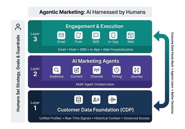 The convergence point is what we call the Agentic Marketing OS: a unified platform where the customer data platform, AI agents, and engagement execution operate as a single system. No handoffs between tools. No data flowing through integration middleware. No latency between decision and action. And critically — humans at the top of the loop, setting direction, monitoring outcomes, and course-correcting when the world changes in ways data alone cannot predict.