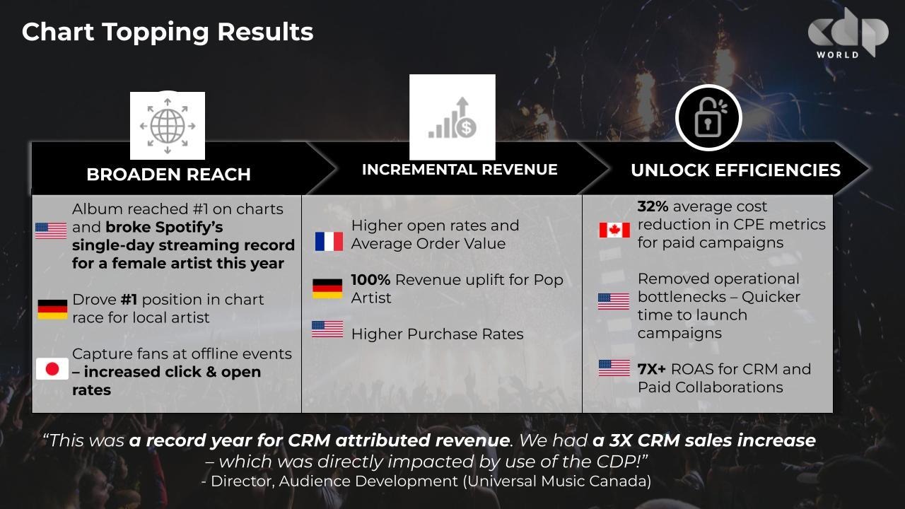 It’s still early, but the results to date have been impressive. UMG has broadened its reach. For example, earlier this year, one artist reached #1 on the Billboard charts and broke Spotify’s single-day streaming record for a female. The German team ran a campaign that helped a key artist reach the top of the charts. And in Japan, where live events are the norm, they are now able to capture fan information attending those events and increase click and open rates.