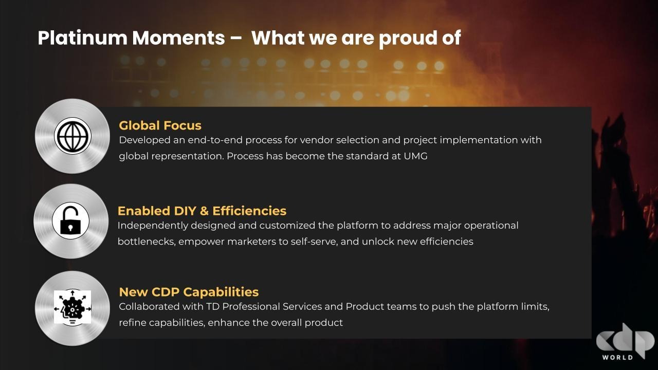 The process of selecting and implementing a CDP took place over four years. It started with assembling the right team from around the world to ensure all voices were heard. Once that team was in place, the vendor selection journey moved from 20 initial vendors, down to a shortlist of four. After many demos using UMG-provided use cases (some very complex) and personas, UMG ultimately selected Treasure Data. Eechambadi said only the Treasure Data could handle the complexity they faced.